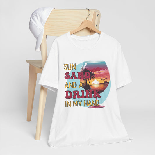„Sun, Sand and a Drink in My Hand“ T-Shirt – Sommer Shirt mit Cocktailglas & Sunset-Design | Strandmode für Damen & Herren