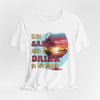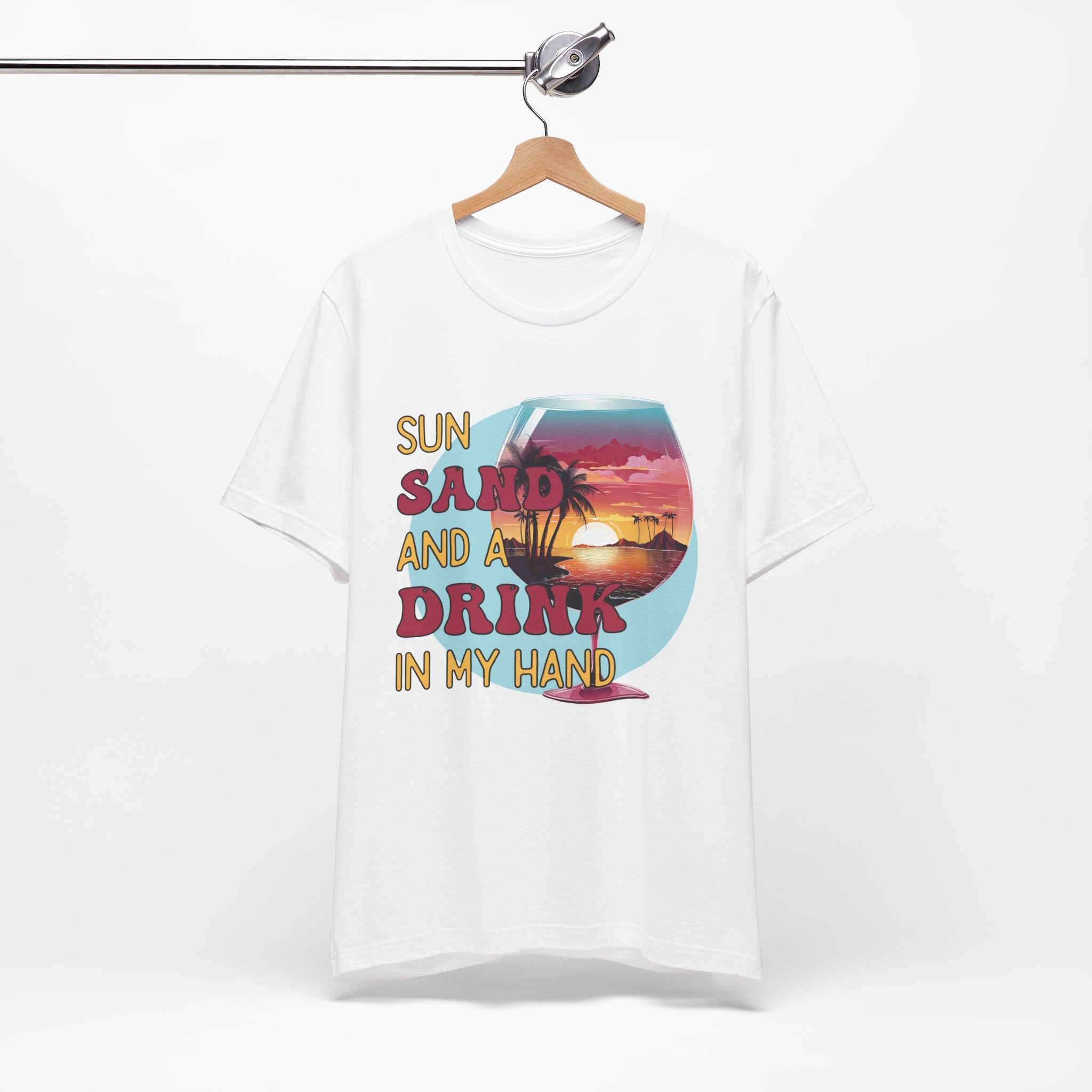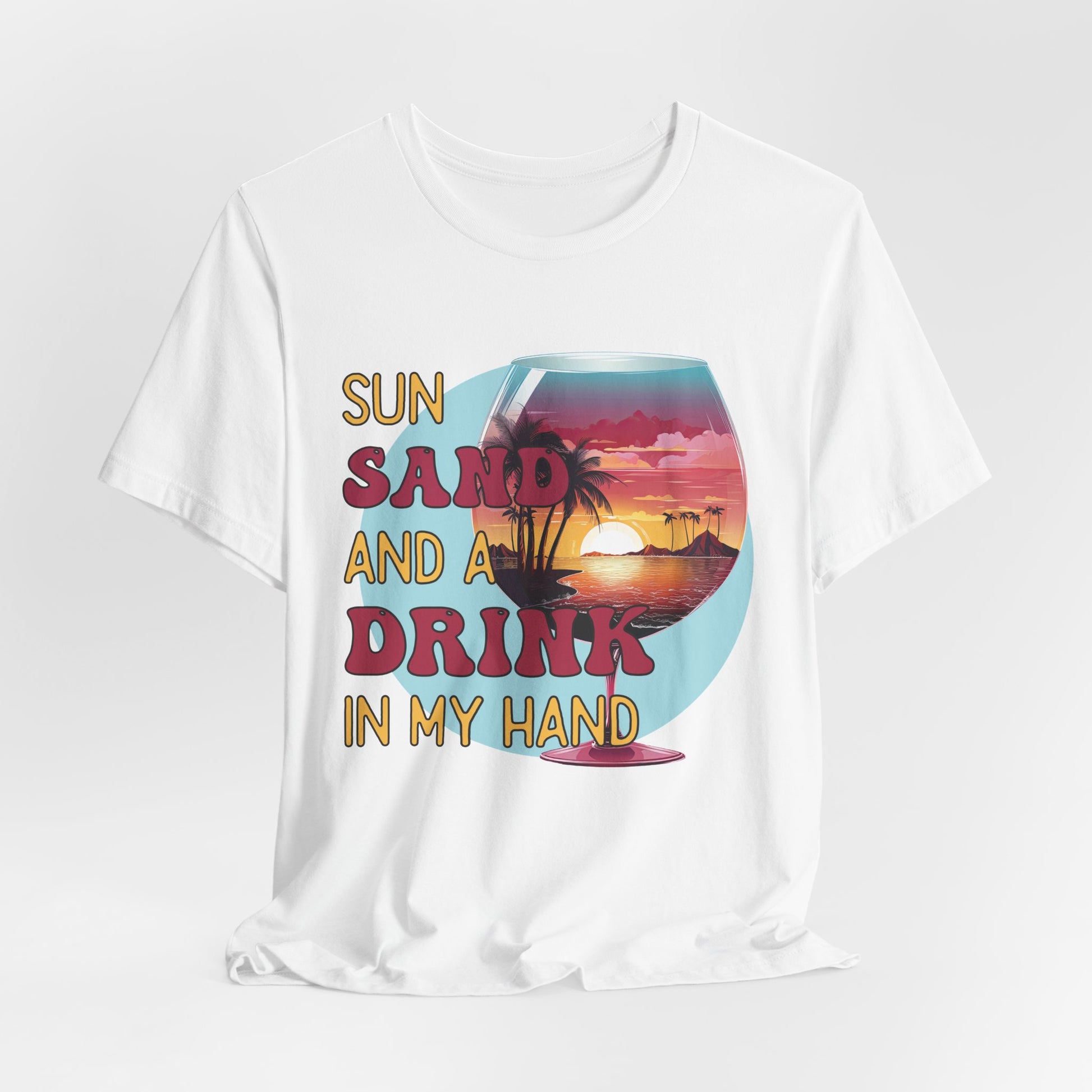 „Sun, Sand and a Drink in My Hand“ T-Shirt – Sommer Shirt mit Cocktailglas & Sunset-Design | Strandmode für Damen & Herren